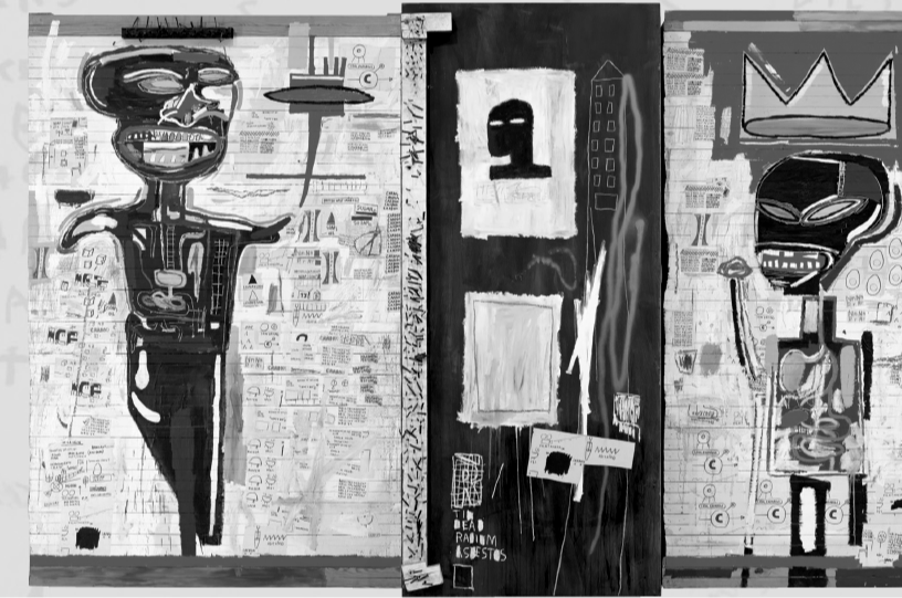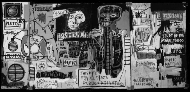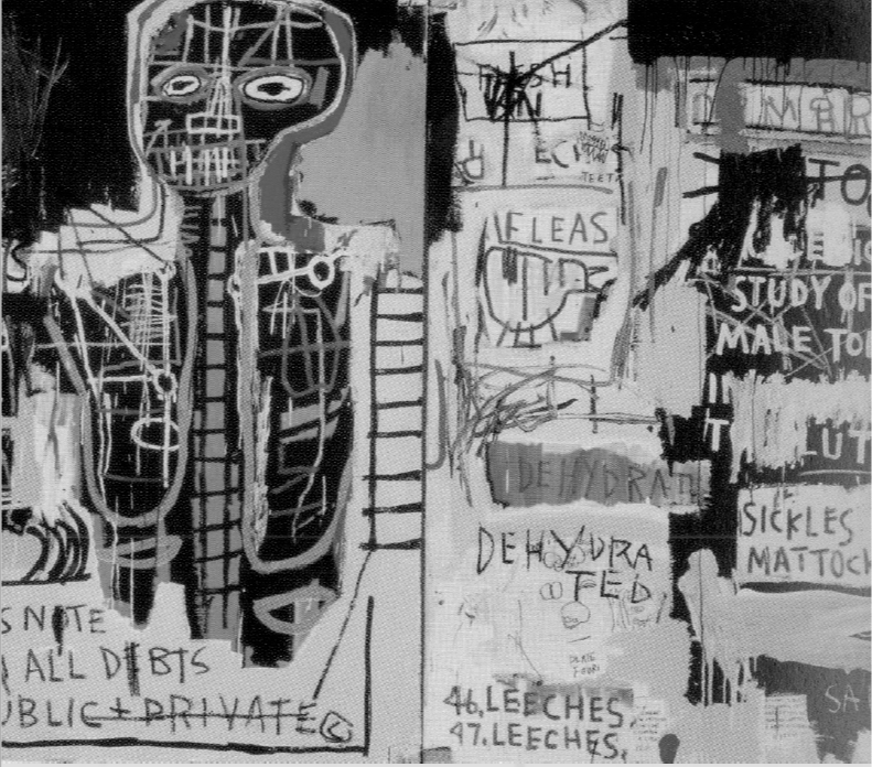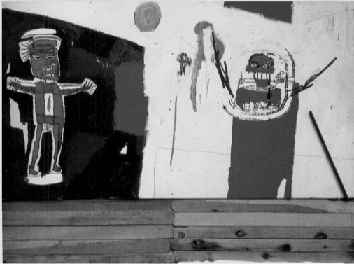 «Basquiat sólo trabajaba sobre papel y en materiales alternativos, como puertas y ventanas que recuperaba de la basura, pues carecía de dinero para telas y bastidoras».» S. F.
