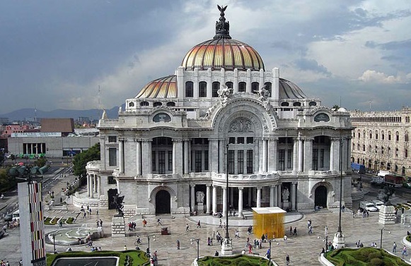 El palacio de Bellas Artes, diseñado por el arquitecto Adamo Boari, está coronado por la curvatura —característica del art nouveau, de la triple cúpula—, que se sitúa entre el vestíbulo y la sala. Si se tiene la buena suerte de encontrarlo cerrado, disfrutaremos del gran telón de más de un millón de cristales opalescentes sobre lámina de acero; es una pieza única, proyectada desde el inicio como cortina incombustible.