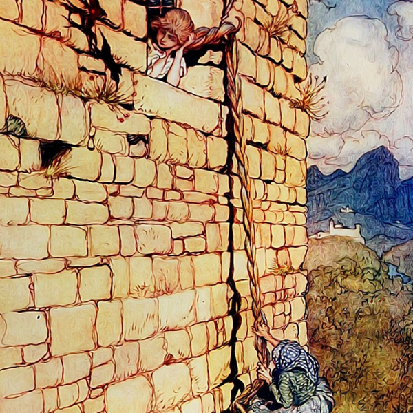 Otro de los cuentos para niños típicos de los Grimm es Rapunzel, una historia muy cruel también; en donde la bruja se lleva a vivir a la hija de una pobre pareja a una torre sin puertas y sin escaleras, y le pide para subir que tire sus largas trenzas. Después, un príncipe la visita en la torre y cuando la bruja se entera que el príncipe sube a verla, le corta el pelo y la lleva al desierto, dejándola sola y sin comida, mientras que al príncipe le tiende una trampa con las trenzas y lo tira por la torre. Queda ciego por la caída y se pone a vagar por el bosque durante dos años, hasta que Rapunzel lo encuentra y con sus lágrimas le devuelve la vista.