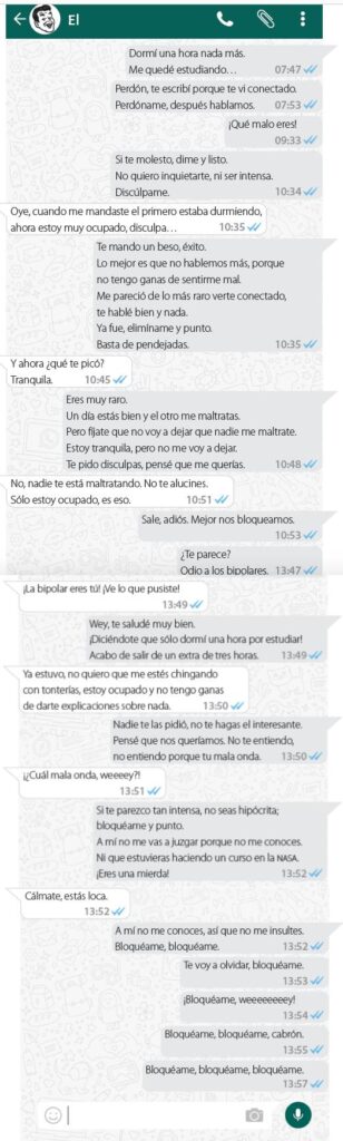 No cabe duda que hoy en día la mayoría de las interacciones entre hombres y mujeres se hacen a través de chats, de conversaciones escritas en los diversos medios, desde el WhatsApp hasta los mensajes directos de Twitter, pasando por Messenger, Facebook o lo que se acumule esta semana. Lo que quiero decir es que la mayor parte de nuestras interacciones, actualmente, se dan mediante el lenguaje escrito. ¿Qué quiere decir esto? Que nunca antes se había leído y escrito tanto; pero ¿cómo se escribe? Y ¿cómo se lee?, ¿se entiende lo que se lee? o ¿hacemos como que entendemos? Bueno, empecemos con esta «joyita» tomada de una conversación real entre dos personas, una mujer de 23 años y un hombre de 24 años: